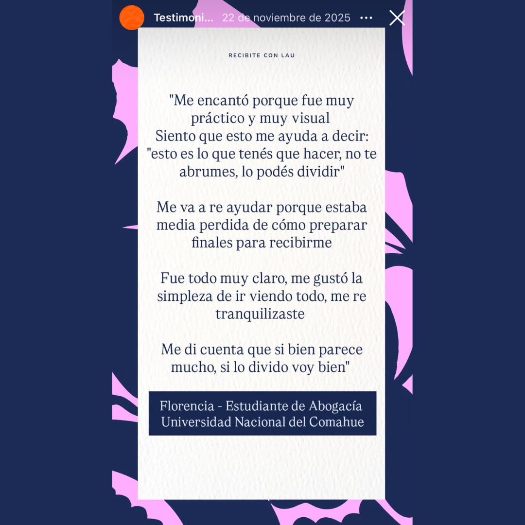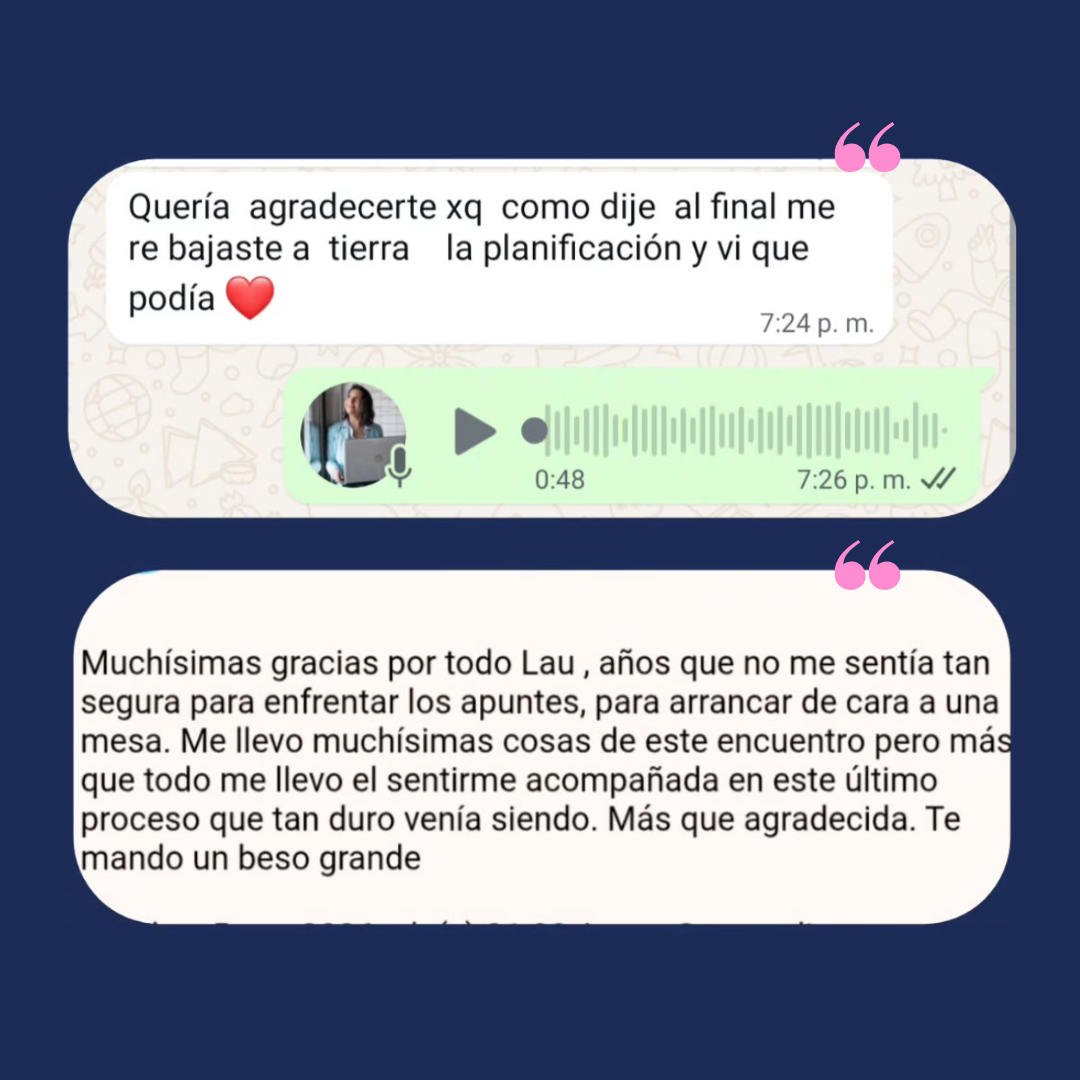 En este encuentro no solo armamos una planificación, sino una estrategia de organización del estudio pensada especialmente para vos, tu ritmo y tu contexto. Te llevás un plan claro y accionable para pasar del “tengo que estudiar” a saber exactamente qué estudiar, cuándo y cómo hacerlo.
