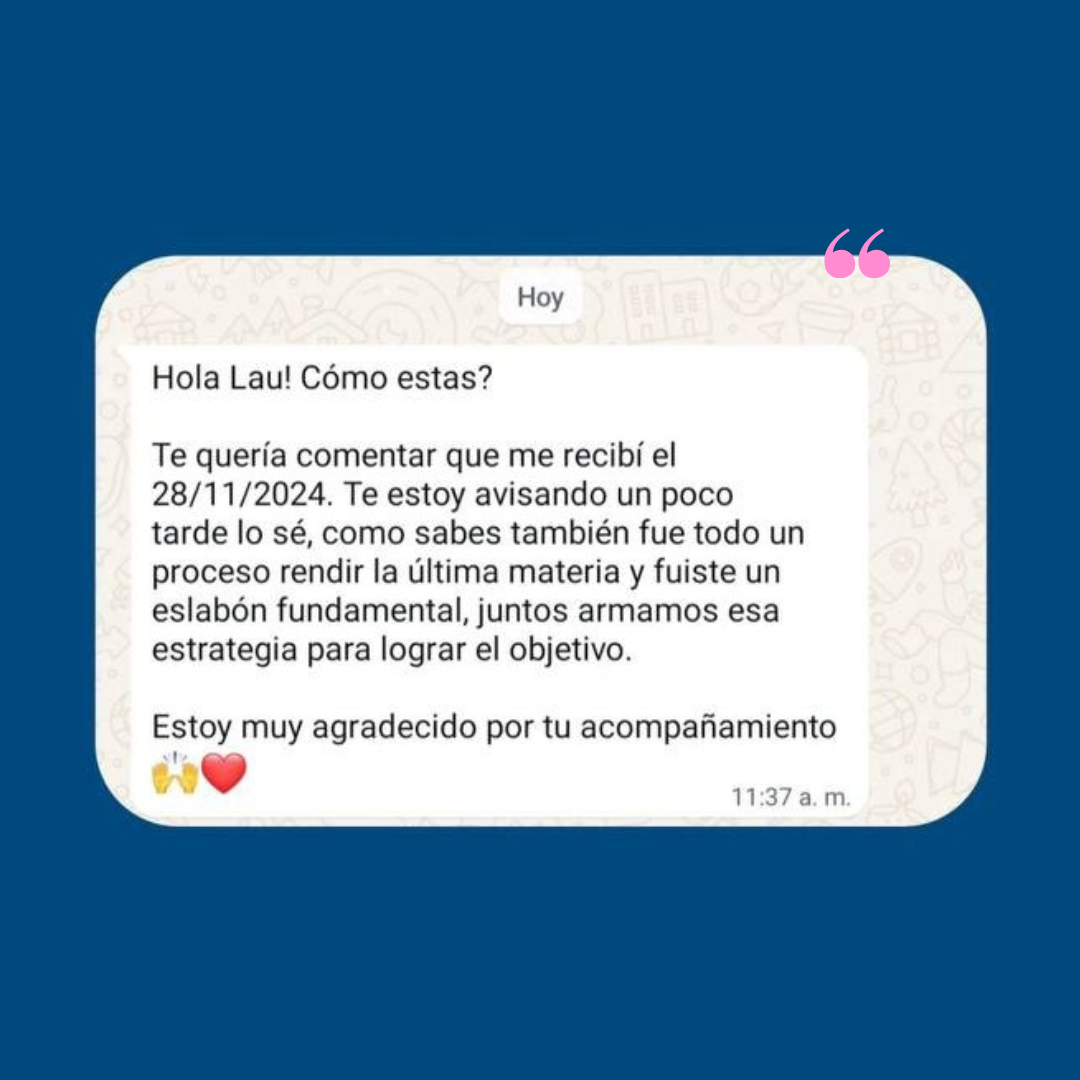 Podría decirte que es un encuentro de 90 minutos por Meet, pero es mucho más que eso. Es un encuentro cercano en donde realizamos la planificación para que llegues a rendir tu próximo exámen con total tranquilidad.