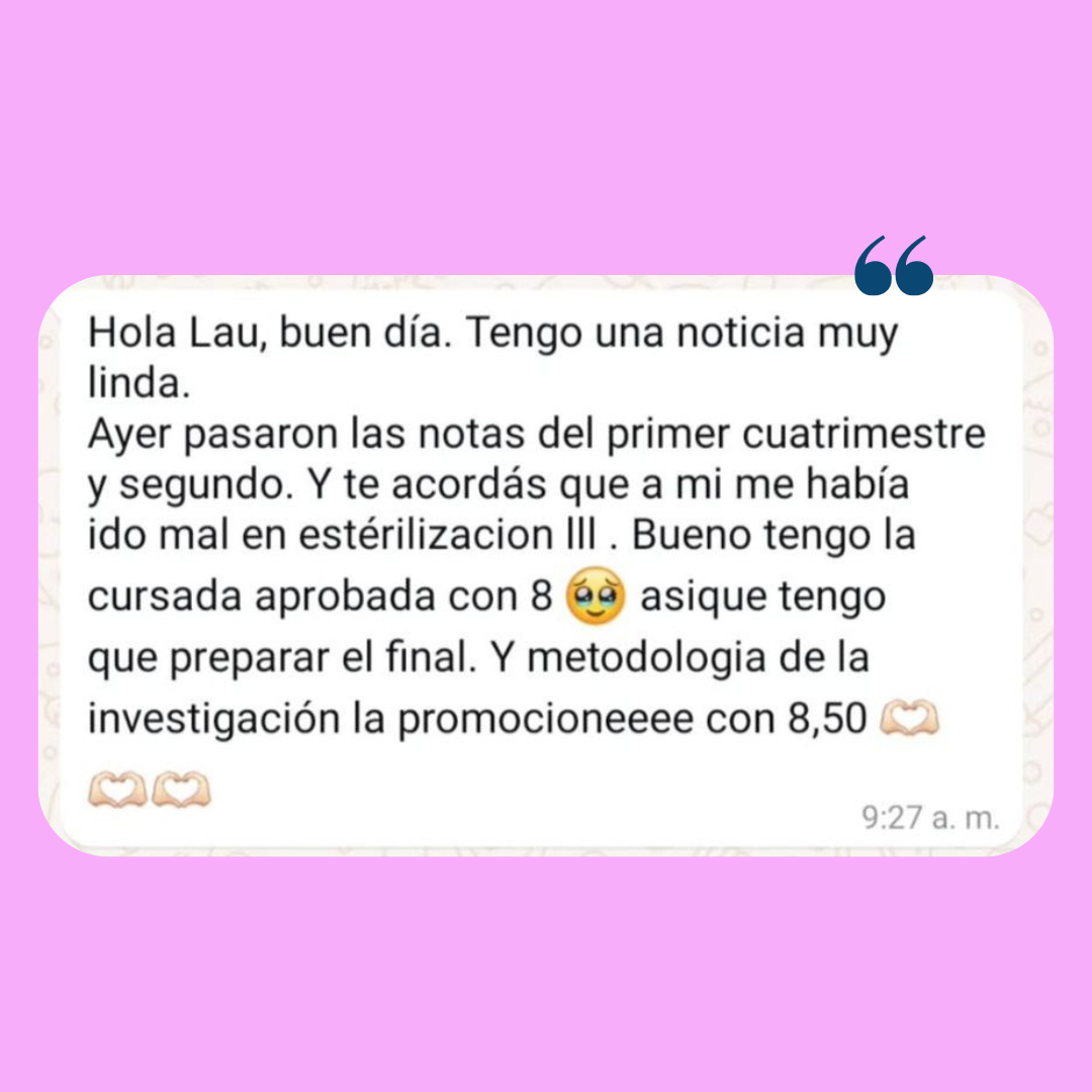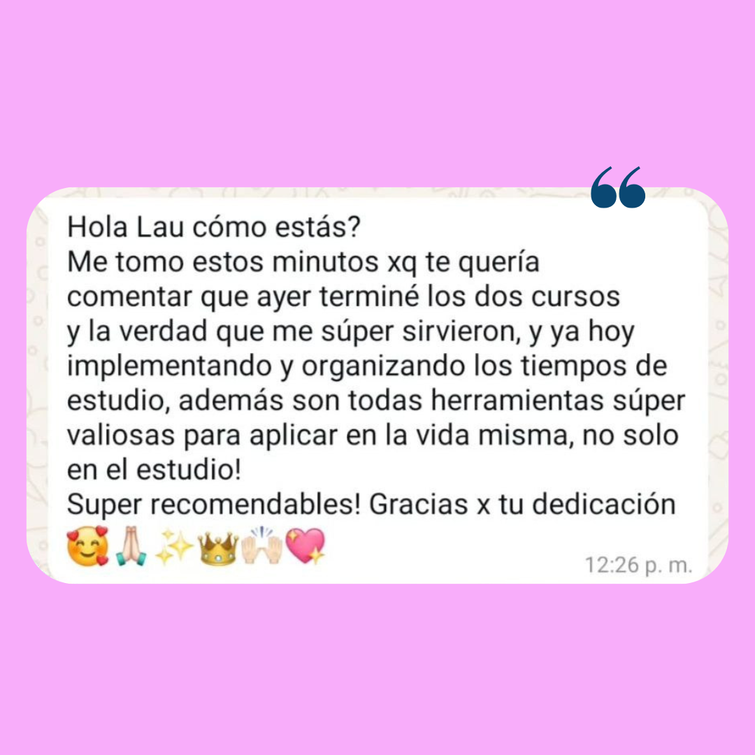 Creé este curso reuniendo las técnicas de planificación y gestión del tiempo que me permitieron organizarme, avanzar y recibirme. Más de 100 estudiantes de Argentina, Chile y Uruguay ya aplicaron este método para estudiar de manera más estratégica y efectiva.
